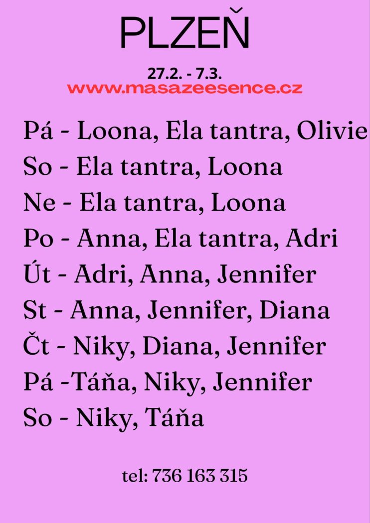 Seznamka pro intimní flirt a erotické masáže 💋 Vítám tě v salonu Masáže Esence, kde tě čeká dokonalá erotická masáž, při které zapomeneš na všechny starosti. Jsem smyslná dívka, která miluje doteky, ženskou energii a hru mezi něhou a vášní. Mým cílem je, abys odešel uvolněný, nabitý energií a s úsměvem, který ti zůstane ještě dlouho poté. Jedná se o erotickou masáž s ručním vyvrcholením – jemné, hravé a velmi intimní pohlazení, při kterém se tě dotýkám nejen rukama, ale také stehny, zadečkem i prsy. Každý dotek má svůj význam a každý pohyb probouzí tvoje smysly. Masíruji zcela nahá, aby bylo spojení ještě intenzivnější a přirozenější. Pro ty, kteří chtějí zažít něco speciálního, nabízím také extra masáže: - Tajemná masáž prostaty – hluboké uvolnění a silný prožitek. - Zpětná masáž tělem – maximálně smyslné propojení energie.